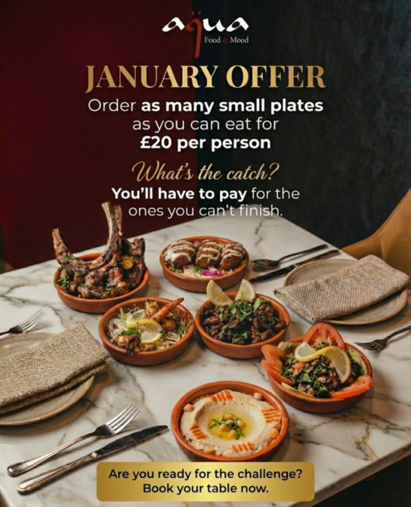 Aqua has introduced the heritage and culture of the Middle East through its divine Lebanese cuisine in its chique elegant ambience, where you will feel as though your surroundings are reminiscent of the Middle East. This has been fused with modern eating; social culture to create a buzzing, safe place to ENJOY VIBES & DINE so you can create precious memories from the best experiences. Aqua Food & Mood prides itself on a very traditional menu with a huge choice of vegetarian and vegan dishes, served in small plates making choice easy and food picking extremely exciting. With hot and cold mezze, mouthwatering grills, world flavoured premium burgers & wings, there is something for everyone. We boast an exclusive Dry bar with the best 0.0% mixes of drinks you'll ever see . With separate dining areas we can host large parties, corporate and family dinners or just a romantic table for